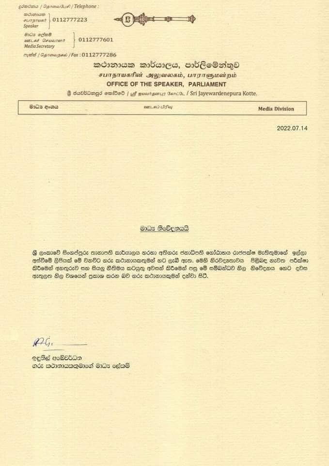 Sri Lanka’s speaker of parliament has received the letter of resignation from President Gotabaya Rajapaksa through the country’s embassy in Singapore, the parliamentary speaker’s office said.