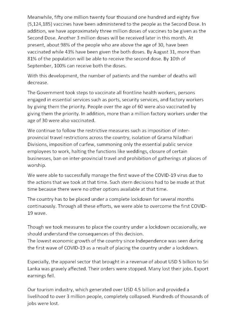All citizens above the age of 30 years are expected to be fully vaccinated against COVID-19 by the 10th of September, President Gotabaya Rajapaksa said addressing the nation.