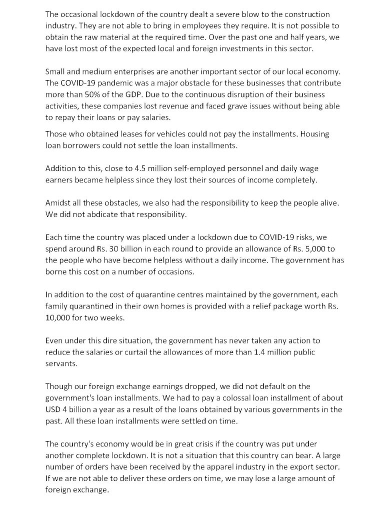 In addition to the cost of quarantine centres maintained by the government, each family quarantined in their own homes is provided with a relief package worth Rs. 10,000 for two weeks, the President continued. “Even under this dire situation, the government has never taken any action to reduce the salaries or curtail the allowances of more than 1.4 million public servants.”