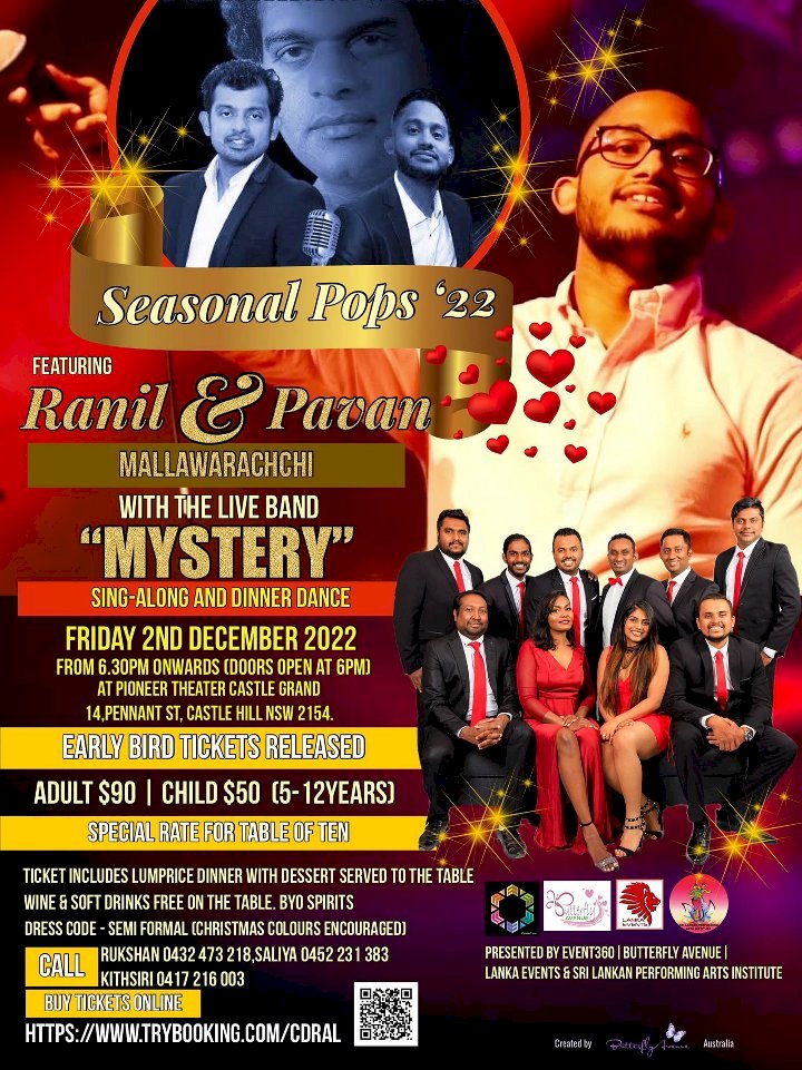 A Sing-Along & Dinner Dance featuring RANIL Mallawarachchi and PAVAN Mallawarachchi, tributing the famous hit songs of one of the Sri Lanka's legendary singers from past, late Milton Mallawarachchi, and combined with a Dance Party to rock you on the dance floor by the well known Band MYSTERY.