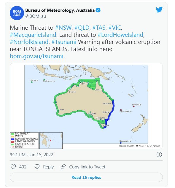 A tsunami warning has been issued for parts of NSW, Victoria, Queensland and Tasmania following the eruption of an underwater volcano. The Bureau of Meteorology (BOM) has issued marine warnings for coastal areas across eastern Australia, including parts of Queensland, New South Wales, Victoria and Tasmania at 9:19 pm AEDT on Saturday.